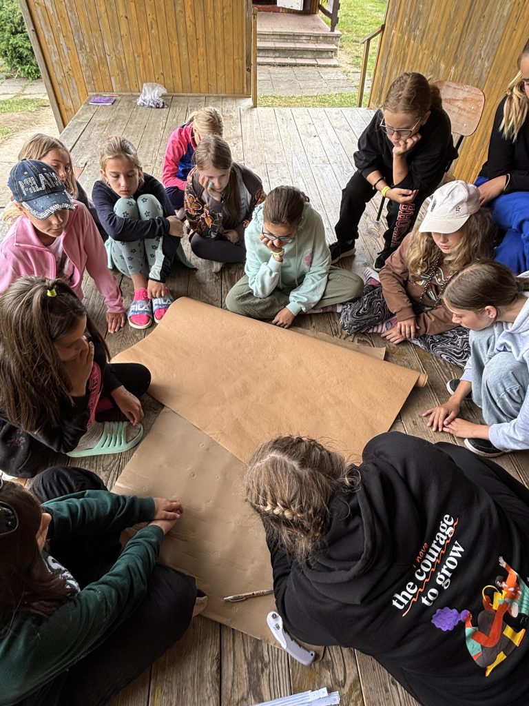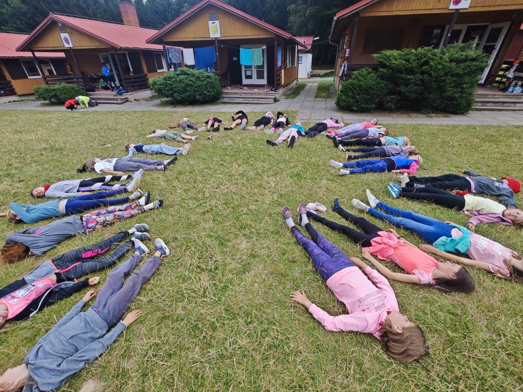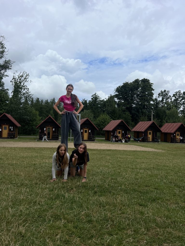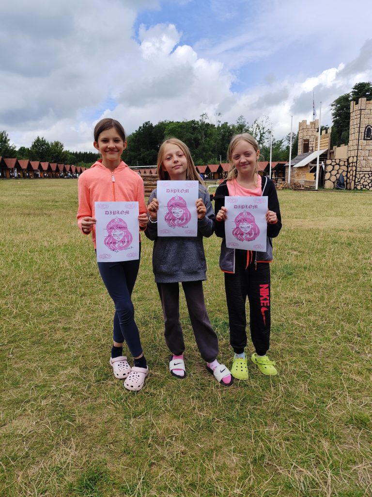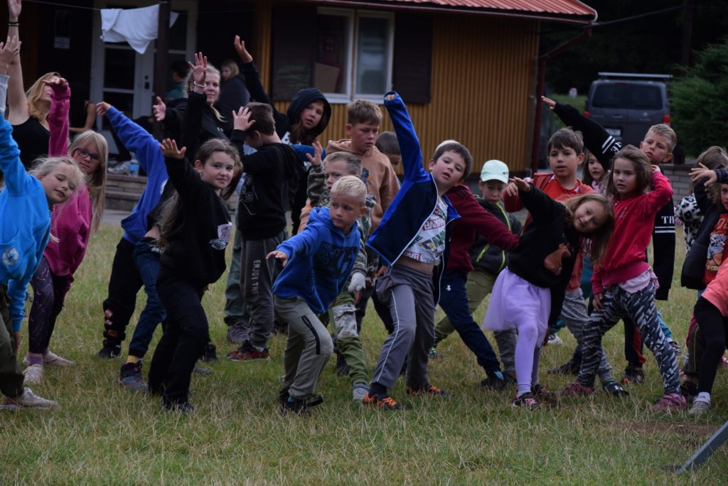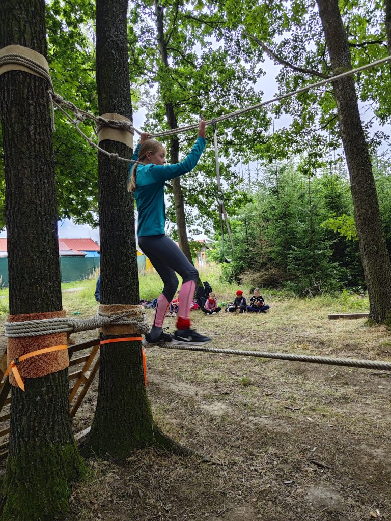 Sobotní ráno začalo společnou rozcvičkou, která nás nabila pozitivní náladou, což se vždycky hodí proti dešti 😉 Pokud nepršelo, hráli jsme si v blízkém okolí, a když zrovna bylo mokro, vedoucí nám připravili aktivity uvnitř. Dokonce jsme si něco dobrého upekli 😀